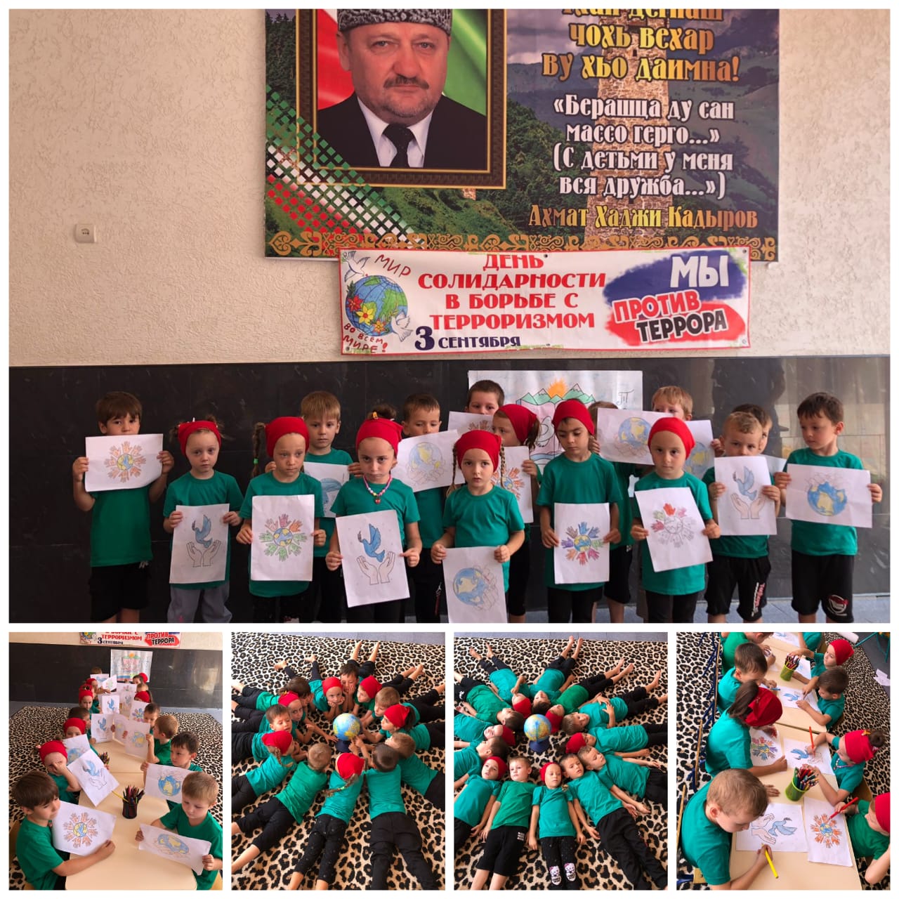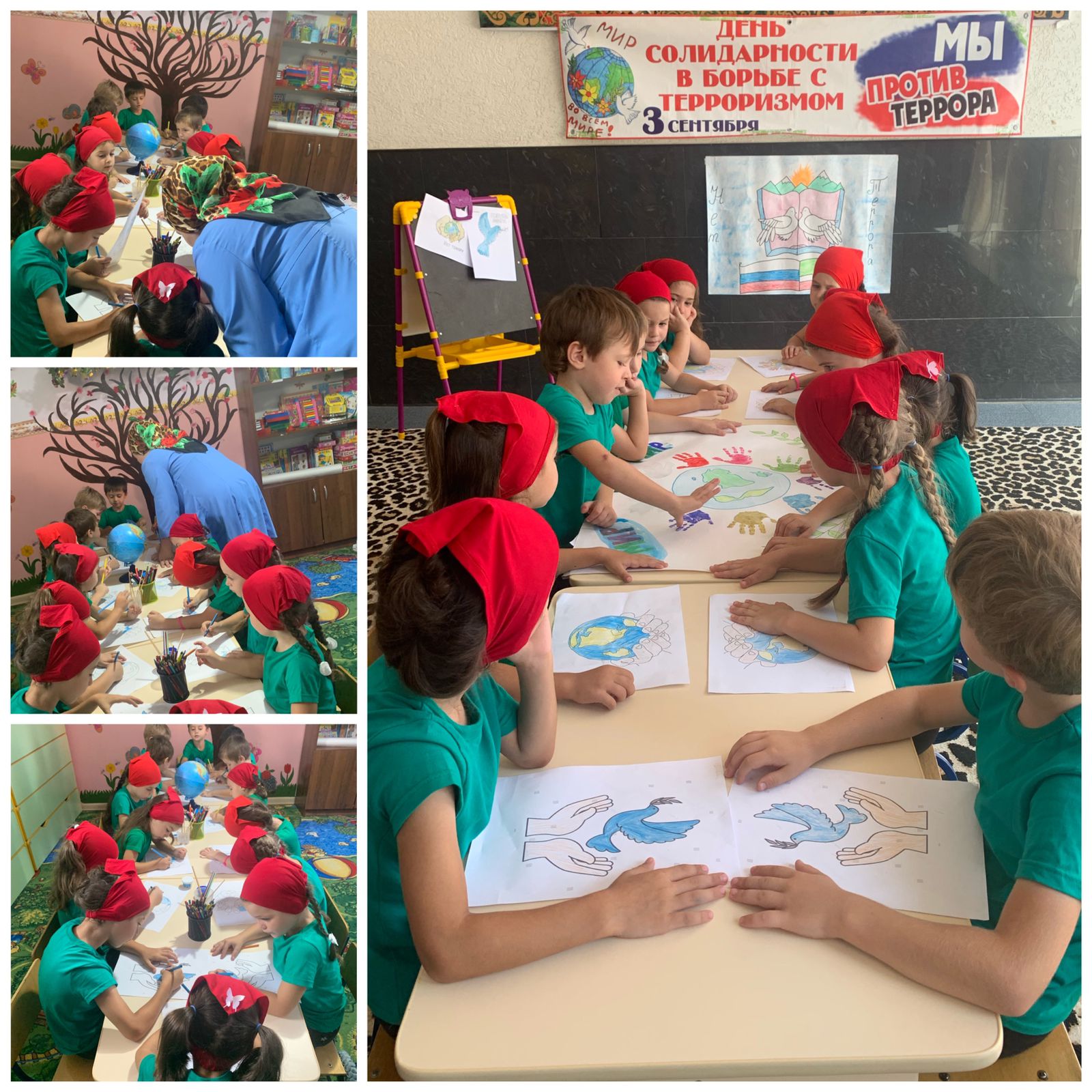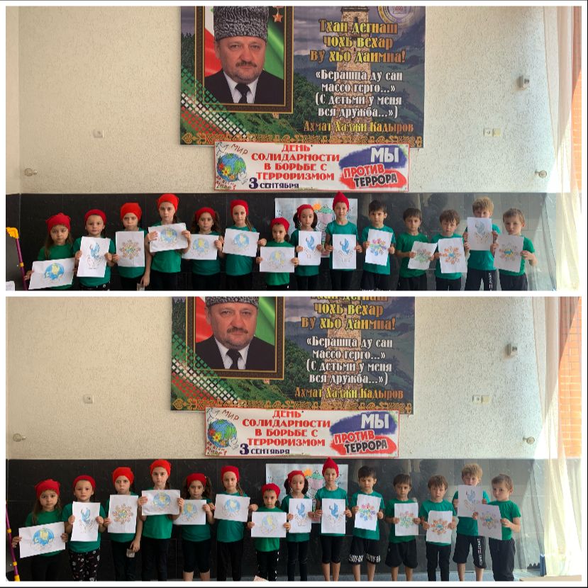 С целью рассказать обо всем этом, объяснить сущность терроризма, акцентировать внимание воспитанников на необходимости проявления бдитель-ности и профилактики совершения террористических актов во всех возрастных группах были проведены тематические беседы о безопасном поведении дома, на улице, в детском саду, что все люди на планете должны жить в мире и согласии. Также был проведен досуг «День солидарности в борьбе с терроризмом», в ходе которого воспитанникам в доступной форме была представлена информация о глобальной проблеме нашей современности – терроризме. В заключении дня солидарности прошла выставка рисунков «Мирное небо над головой». Воспитанники изобразили в своих ярких, выразительных работах радостные и счастливые моменты мирной жизни: теплое солнце, цветы, разноцветную радугу, смеющихся детей.