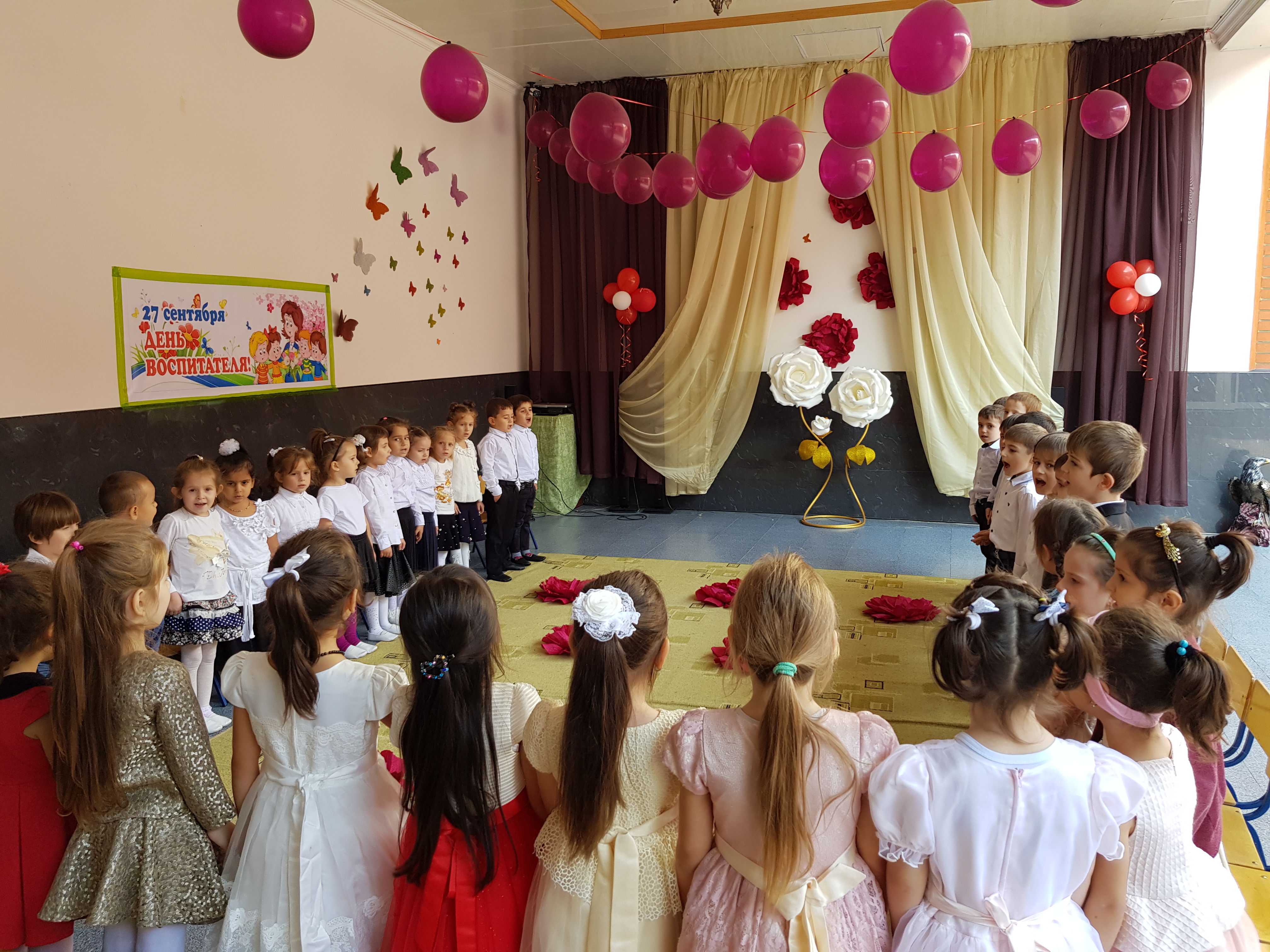 прошел утренник, посвященный коДню работника дошкольного образования. В адрес всего нашего коллектива прозвучало много теплых слов и поздравлений со стороны наших подопечных и родителей. Детьми всех возрастных групп был подготовлен утренник, где было исполнено много песен, стихотворений, зажигательных танцев. У всех остались очень положительные эмоции. Также с детьми провели беседы о том что воспитателивносят значительный вклад в нашу повседневную жизнь.